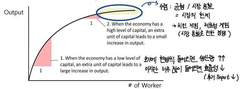 - 생산요소의 투입이 많을 수록 산출증가의 폭 증가