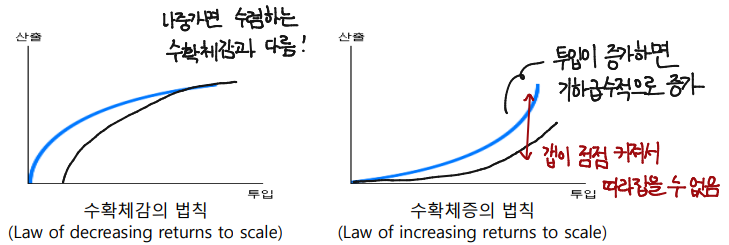 - 수확체증의 세계와 수확체감의 세계는 명확히 분리되지 않음